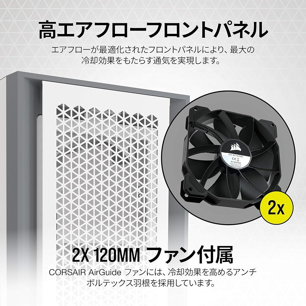「商品状態」11「商品情報 (新品の場合) 」CORSIAR 5000D Airflowは強化ガラス製のサイドパネルを搭載し、内部を見せるPCに適したミドルタワーのATXケースです。ケーブル配線しやすい構造と豊富な冷却オプションで高性能パーツにも対応。フロントとトップのメッシュパネルが豊富なエアフローを生み出します。