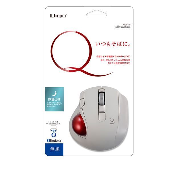 Y●静かで小さな親指トラックボール「Q」シリーズ…全てのボタンを静音化。周囲を気にせず操作に集中できます。トラックボールはマウスと違い本体を動かさないので、狭い場所やソファの上でも操作できます。<小さい>34mmボールを搭載しながら、ポケットサイズまで凝縮。薬指と小指が自然な位置に置ける使いやすいフォルムです。<全てのボタンが静音(ホイールスクロール含む)>周囲を気にせず操作に集中できます。<おまかせ速度調整(AutoSpeedControl)>ポインターの速度をトラックボールの動きに合わせて調整するおまかせ機能。SPEEDボタンを押すだけで固定モードと切り替えられます。<ラクラクWEB閲覧(5-button)>Web閲覧を快適にする進む・戻るボタン。<ボタンの割当変更可能>「ホイール・進む・戻る」ボタンを他の機能に変更することができます。当社ホームページからマウス割当ソフト[Digio2MouseSetting]をインストールしてください。※<レーザーセンサー>読み取り精度の高いレーザーセンサーを使用(光は見えません)。<セラミック支持球>丈夫で抵抗感が少ないセラミック支持球でボールを支えます。