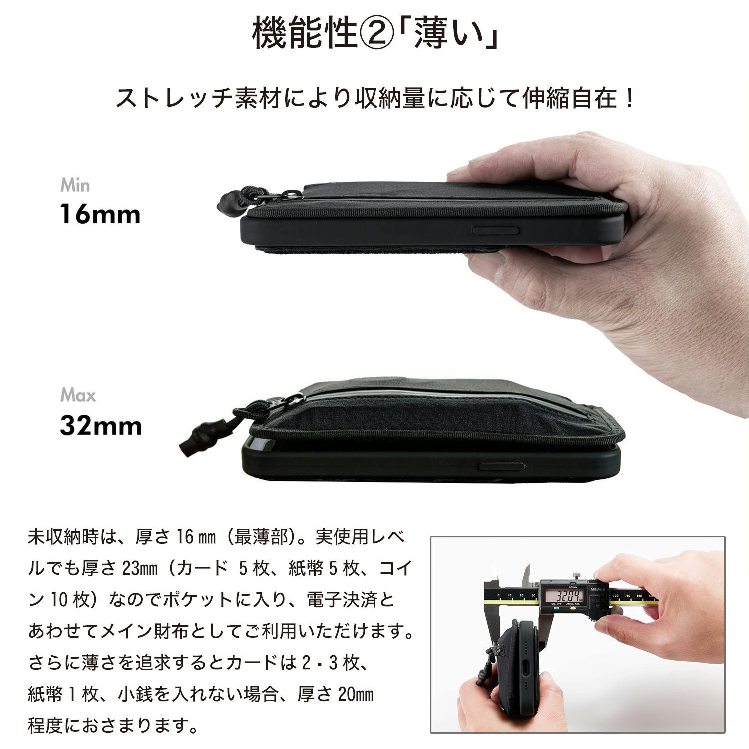 最大容量:カード10枚、紙幣5枚、コイン20枚、名刺10枚、鍵