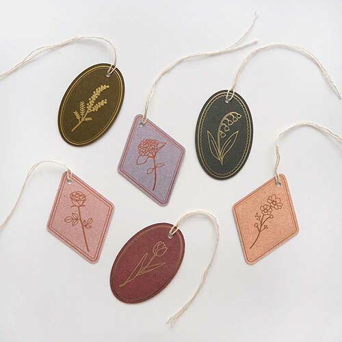 クラフト感のあるカードに、一輪のお花の箔押しをあしらったギフトタグ。楕円形のタグには金箔を、菱形のタグにはコッパー箔を使い、上品なデザインに仕上げました。裏面にメッセージが書けるので、ひとこと気持ちを添えたいときにおすすめです。風合いのあるリネンの紐つきで、贈り物に付けるとラッピングのアクセントになります。【検索ハッシュタグ】#エルコミューン#フローラ#ギフトタグ#バラ#コッパー