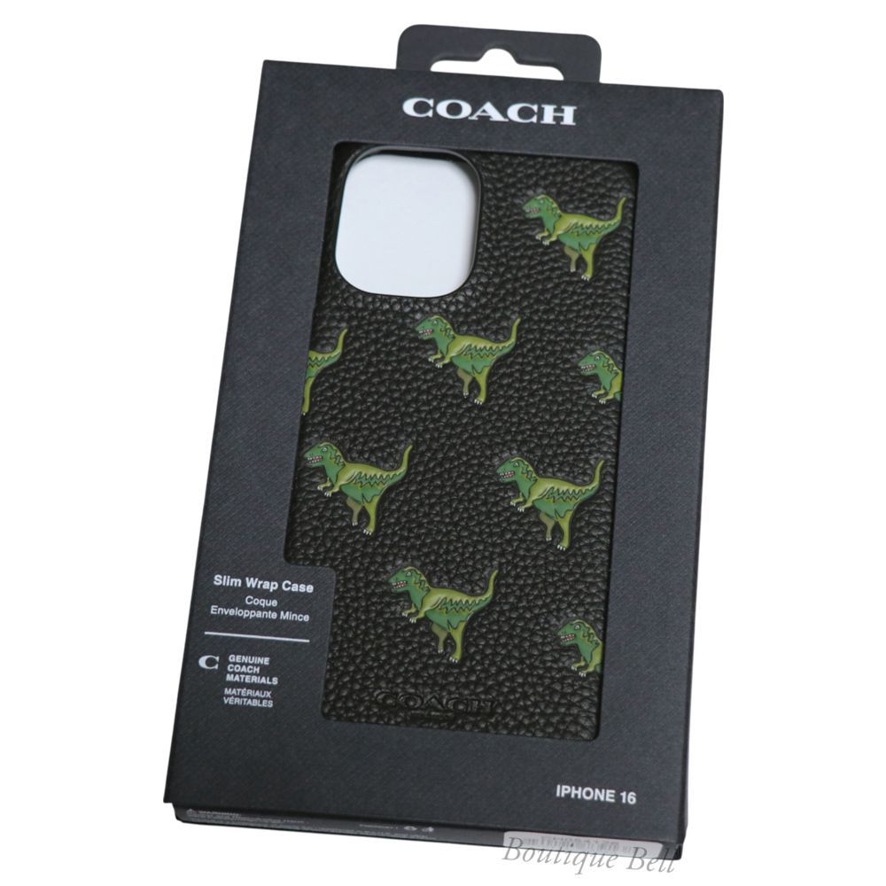 COACHの人気アイコンキャラクター「レキシー(恐竜)」がデザインされた、遊び心溢れるプレミアムなiPhoneケースです。上質なブラックレザーに、グリーンのレキシーがあしらわれた愛らしいパターンが特徴で、ラグジュアリー感と可愛らしさが絶妙に融合しています。