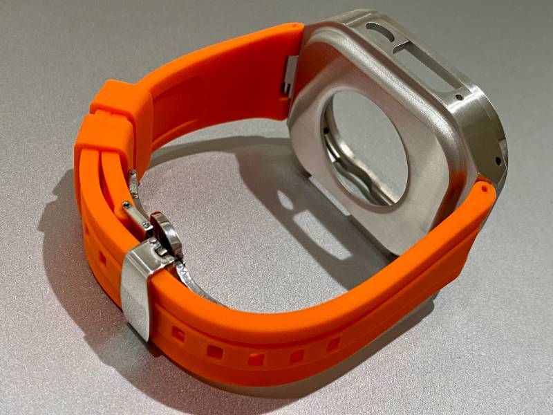 オレンジシルバー AppleWatchカバーケース 脱着 簡単 保護 49㎜m Ultra カスタム ステンレス ベルト ラバー バンド アップルウォッチ対応