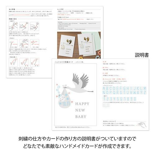 3色の刺繍糸で自由にアレンジできるカードです。箔押し加工と印刷が施されたカードにちょっとしたひと手間を加えることで、気持ちがより丁寧に伝わるカードを作ることができます。手作りは特別感があり、ご出産のお祝いにぴったりです。カード本体には、あらかじめ刺繍糸を通すための穴があけられています。穴に沿って糸を通すだけで手軽にハンドメイドの刺繍カードができあがります。針は付属していませんので直径1mm以下の針をご用意ください。刺繍することで、包みに可愛らしい柄を加えたり、赤ちゃんをおやすみさせてあげることができます。包みには赤ちゃんのイニシャルや誕生日などを刺繍することができます。赤ちゃんの性別に合わせて、リボンの糸色を変えてアレンジすることもできます。カードの表には「HAPPYNEWBABY」のメッセージが箔押しで印刷されています。【検索ハッシュタグ】#デザインフィル#ミドリ#カード#刺繍#おうち時間