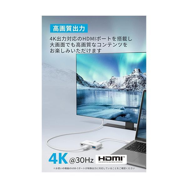 ●3つのポートを1つに、3-in-1USB-Cハブ。色はホワイトです。●ノートPCのUSB-Cポートから、USBPowerDeliveryに対応したパススルー急速充電、HDMI接続、高速データ転送が可能です。