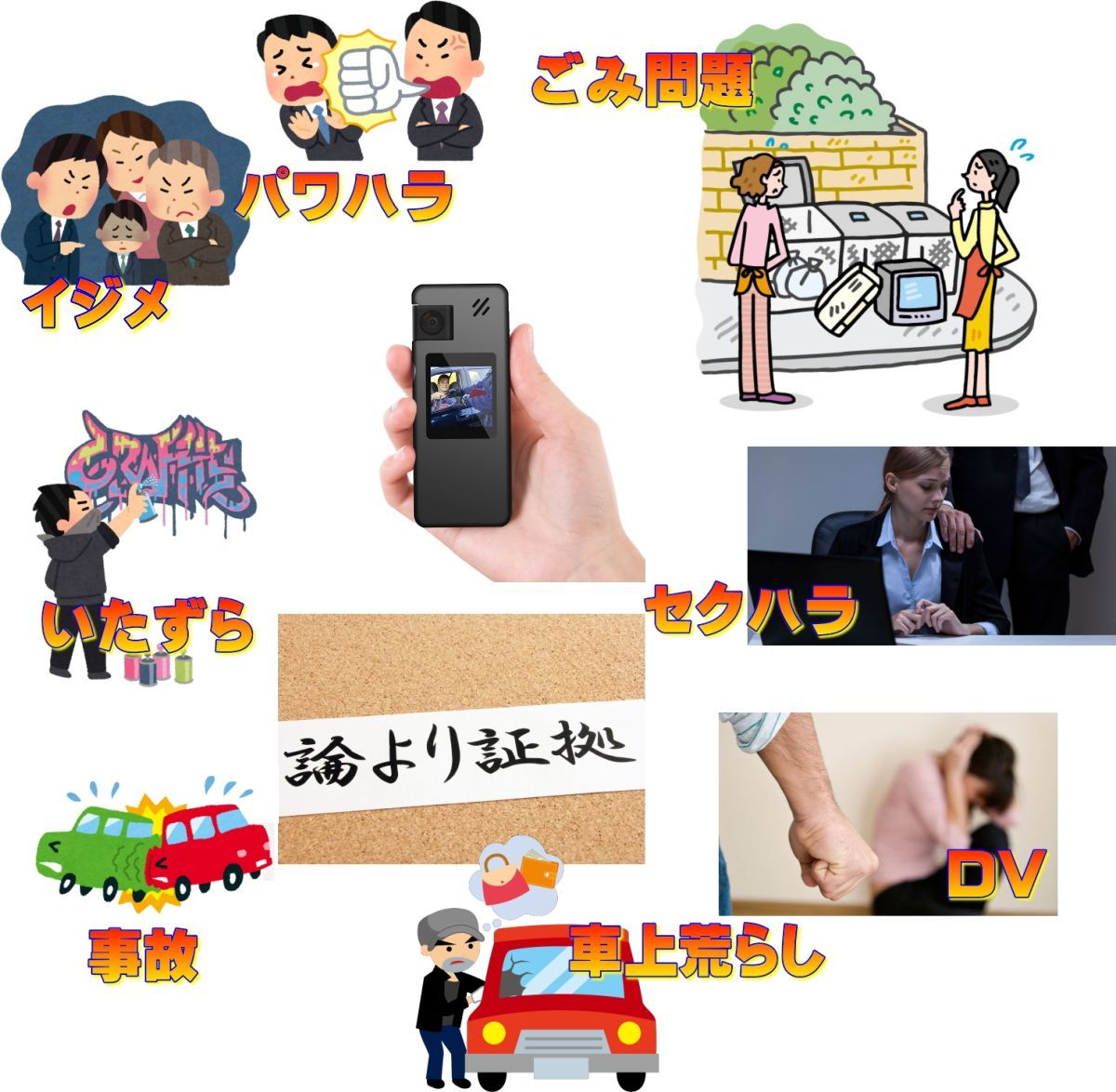 【証拠】プロの警備員、地域防犯係、ショップ、会社、学校、他にも家庭内暴力DVの証拠、セクハラ&パワハラの証拠、いじめの証拠、今や社会問題となっている事を証拠として残す方が増えてきております。