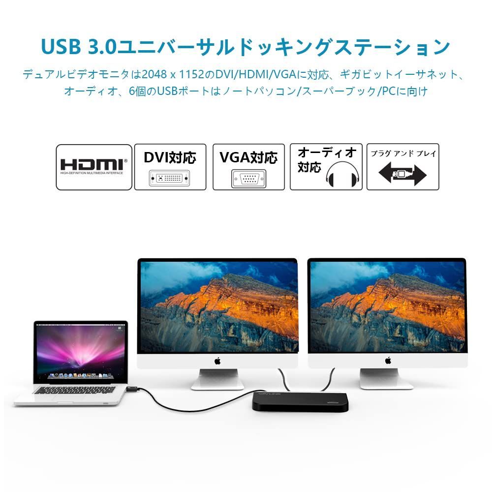 Wavlink USB 3.0 ユニバーサル・ドッキングステーション・デュアル ビデオモニタ・ディスプレイ 最高解像度2048x1152のDVI & HDMI & VGA ポート、ギガビット・イーサネットポート、オーディオ、6つのUSBポートはラップトップ、ウルトラブック、PCなどに対応 USB 3.0 ポートx2、USB 2.0 ポートx4、PSE認定されたAC12V2A 電源アダプター付