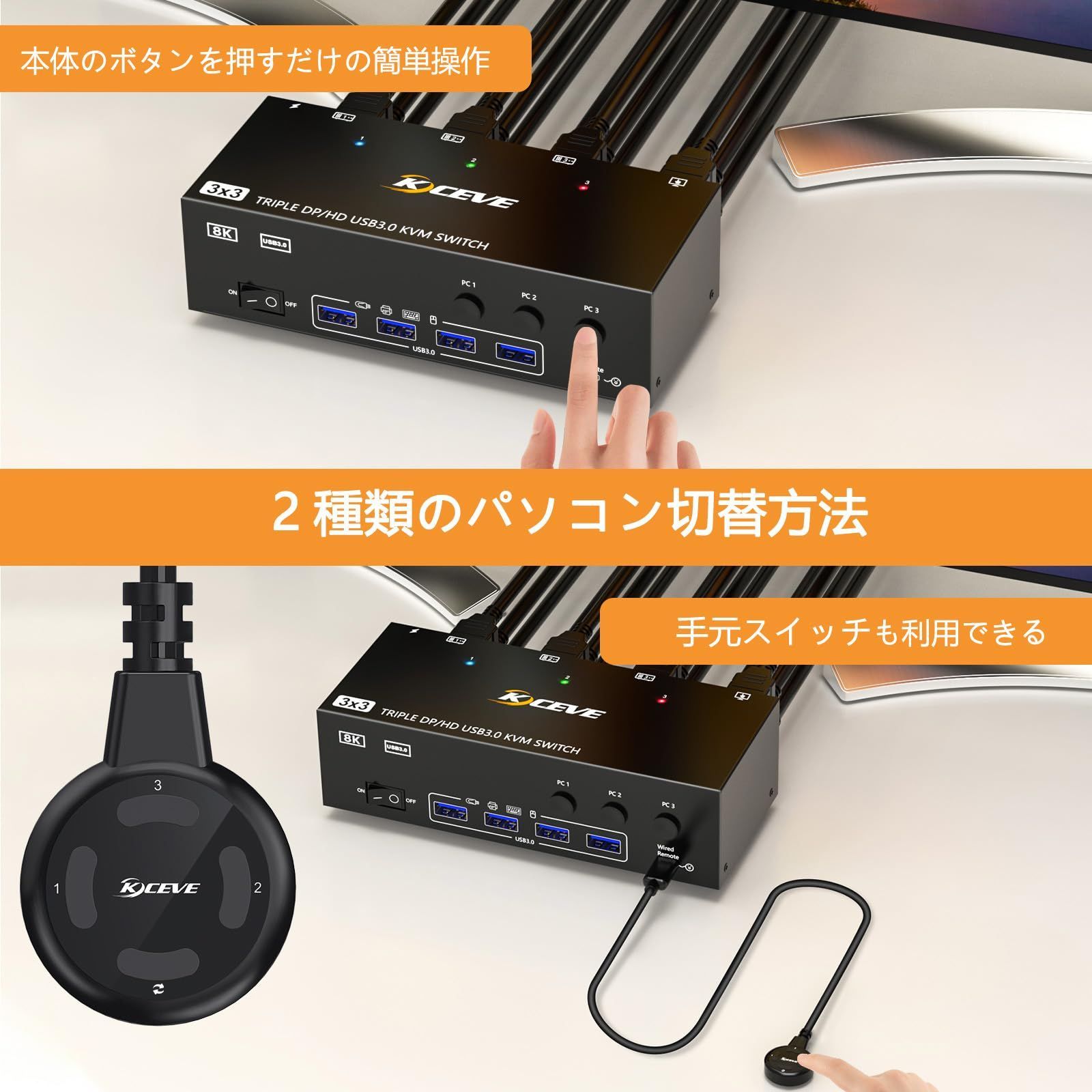 KCEVE 8K KVM切替器 3PC 3モニター、コピー/拡張モード HDMI + DPポート (8K@30Hz/4k@144Hz) USB3.0ポート KVM Switch PC3台とディスプレイ3台対応 キーボード、マウスを3PCで共有 ドライバー不要 簡単に接続 手元スイッチ&USBケーブル付き