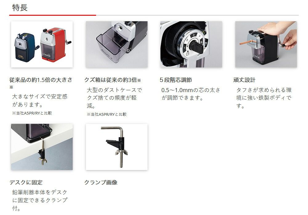鉛筆削器本体をデスクに固定できるクランプ付。