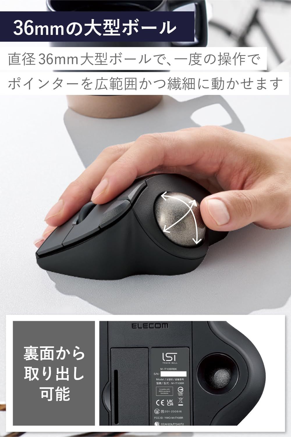 親指にフィットする直径36mm大型ボールを採用し、一度の操作でポインターを広範囲かつ繊細に動かせます。