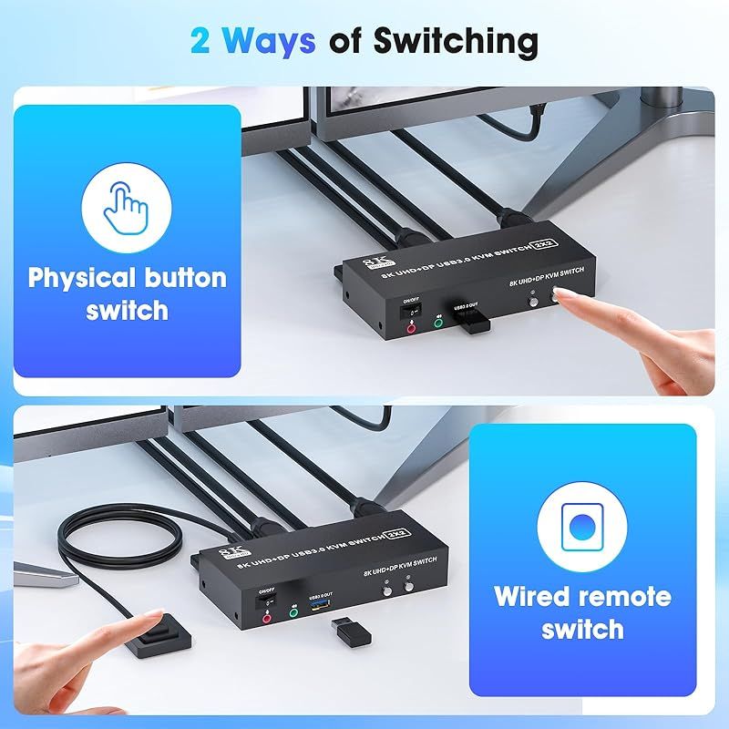 設計された電源アダプターとオンオフスイッチ:kvmスイッチ2モニター2コンピュータディスプレイポートはUSBケーブルで電源を供給され、アップグレードされた5V電源アダプターは、8K 2モニター2コンピュータkvmスイッチがより滑らかに動作し、高電力USBデバイスを接続するときにより安定した認識を提供します。使用中でない場合は、ケーブルを断つことなく、hdmi displayport kvm スイッチをオフにします