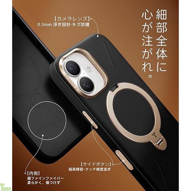 TORRAS iPhone 17 用 ケース 新感覚レザー スキンタッチ リング スタンド MagSafe対応 Ostand Q 3 レザートーン 360°定点回転 縦横両対応 マグネット搭載 革 ワイヤレス充電対応 米軍規格 耐衝撃 指紋防止 アンバ