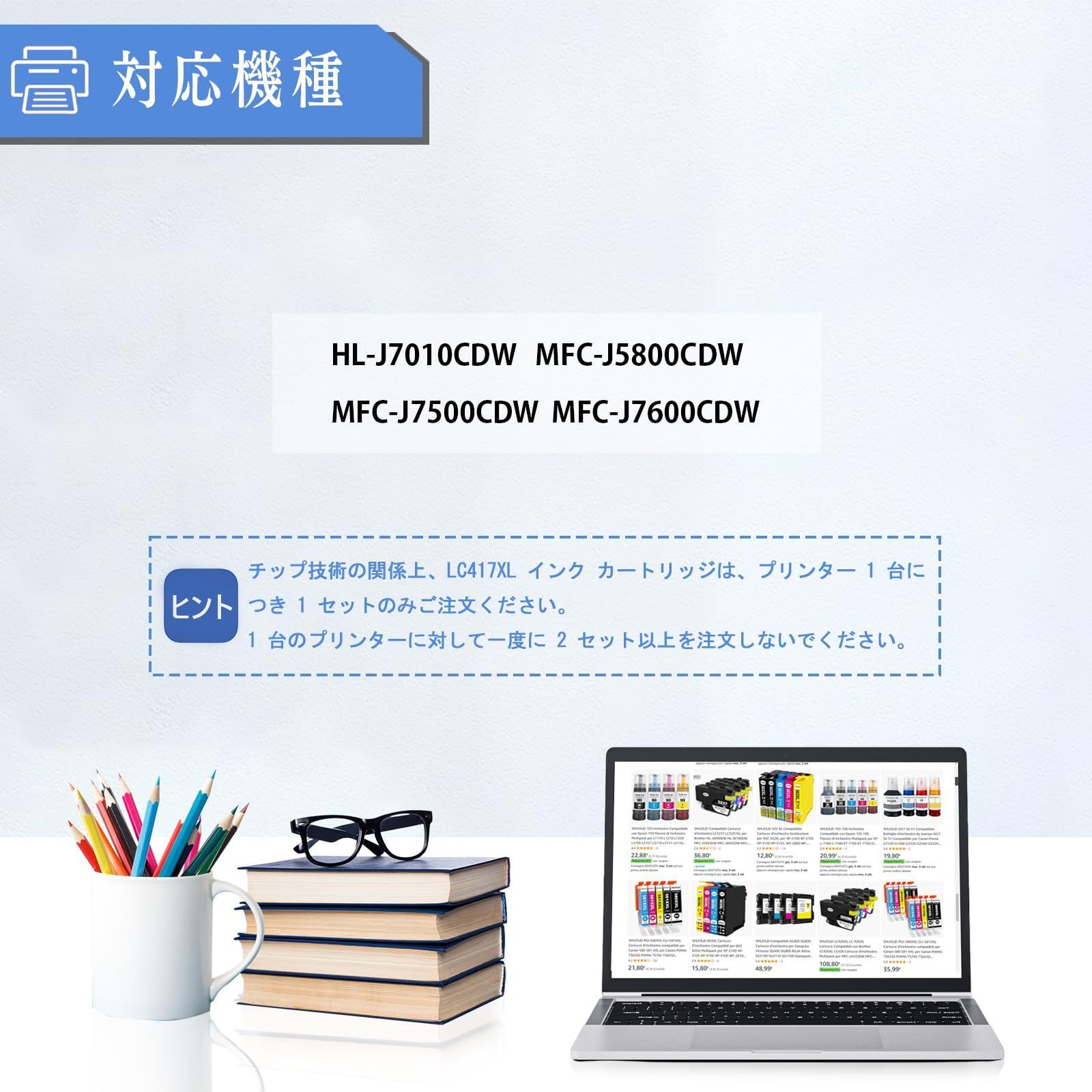 対応デバイス LC417XL互換インクの対応機種はHL-J7010CDW MFC-J5800CDW MFC-J7500CDW MFC-J7600CDW プリンターです。