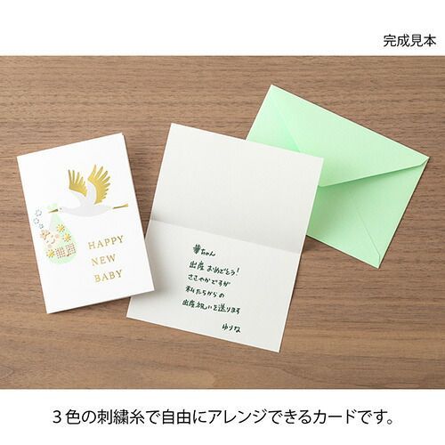 3色の刺繍糸で自由にアレンジできるカードです。箔押し加工と印刷が施されたカードにちょっとしたひと手間を加えることで、気持ちがより丁寧に伝わるカードを作ることができます。手作りは特別感があり、ご出産のお祝いにぴったりです。カード本体には、あらかじめ刺繍糸を通すための穴があけられています。穴に沿って糸を通すだけで手軽にハンドメイドの刺繍カードができあがります。針は付属していませんので直径1mm以下の針をご用意ください。刺繍することで、包みに可愛らしい柄を加えたり、赤ちゃんをおやすみさせてあげることができます。包みには赤ちゃんのイニシャルや誕生日などを刺繍することができます。赤ちゃんの性別に合わせて、リボンの糸色を変えてアレンジすることもできます。カードの表には「HAPPYNEWBABY」のメッセージが箔押しで印刷されています。【検索ハッシュタグ】#デザインフィル#ミドリ#カード#刺繍#おうち時間