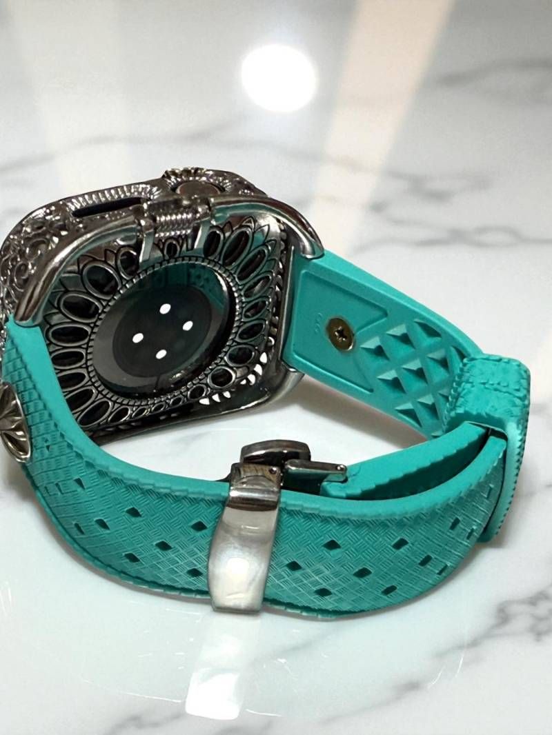 重厚感あふれる彫刻調デザインのメタルカバーと、耐久性・快適性に優れたZEEPフッ素ラバーバンドを組み合わせたApple Watch用カスタムセットです。