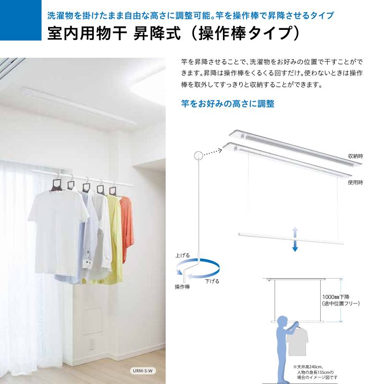 物干し竿を昇降させることで、洗濯物を邪魔にならない高い位置で干すことができます。