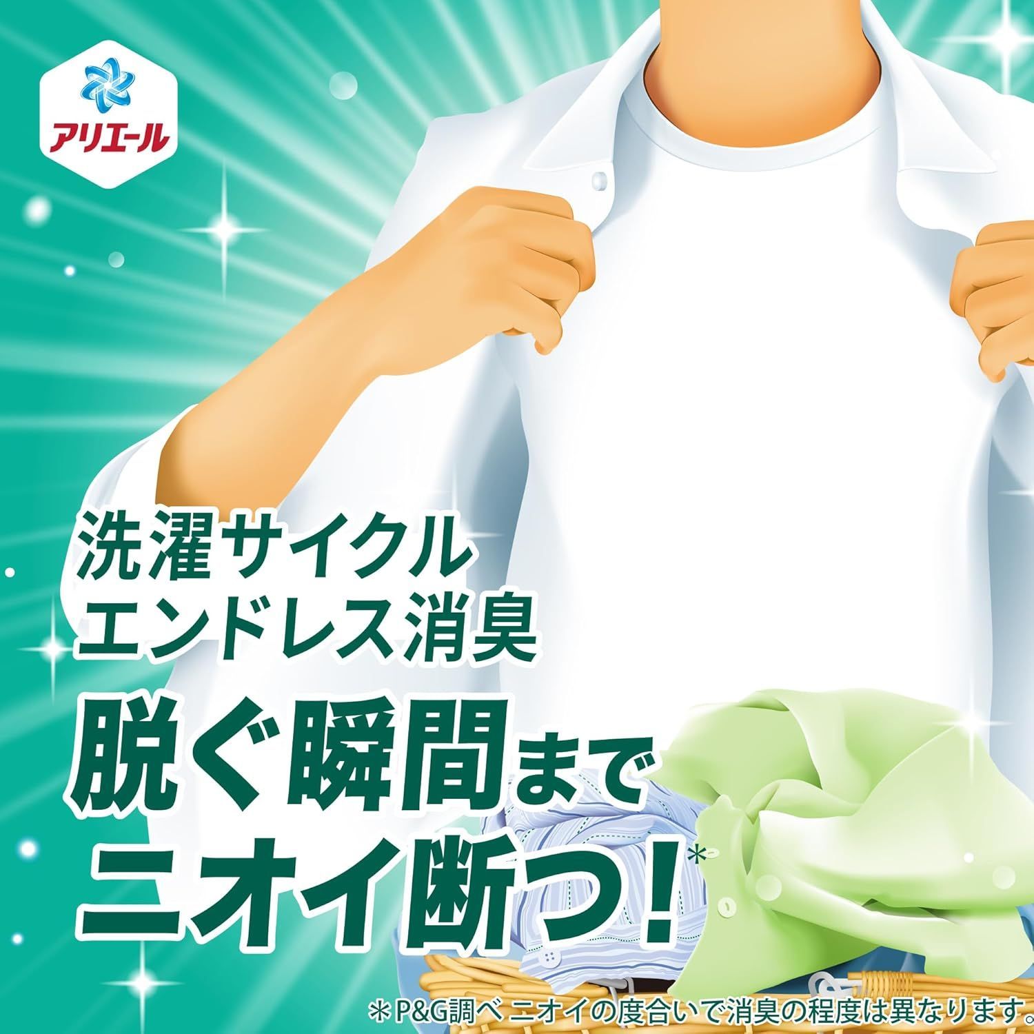 *1 P&G調べ。ニオイの度合いで消臭の程度は異なります。 *2 アリエール超抗菌プレミアムシリーズにおいて。 *3 全ての菌の増殖を抑えるわけではありません。 *4 カビは除去しません。 *5 2023年のアリエール超抗菌プレミアムシリーズ比。