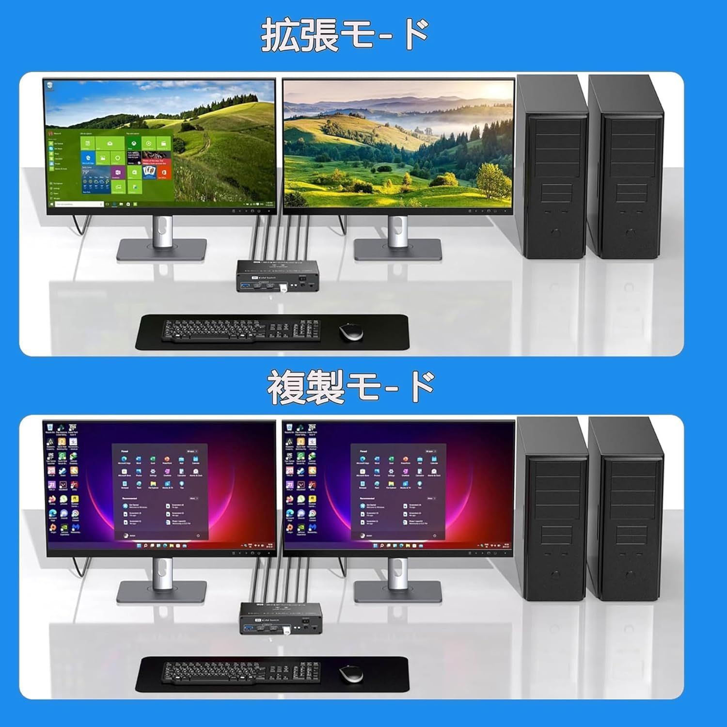 2モニター同時表示可能、作業の幅が広がる: デュアル ディスプレイ KVM スイッチは2つのモニターにそれぞれ別の映像を表示できるため、作業スペースが広がり、マルチタスク作業が快適に行えます。