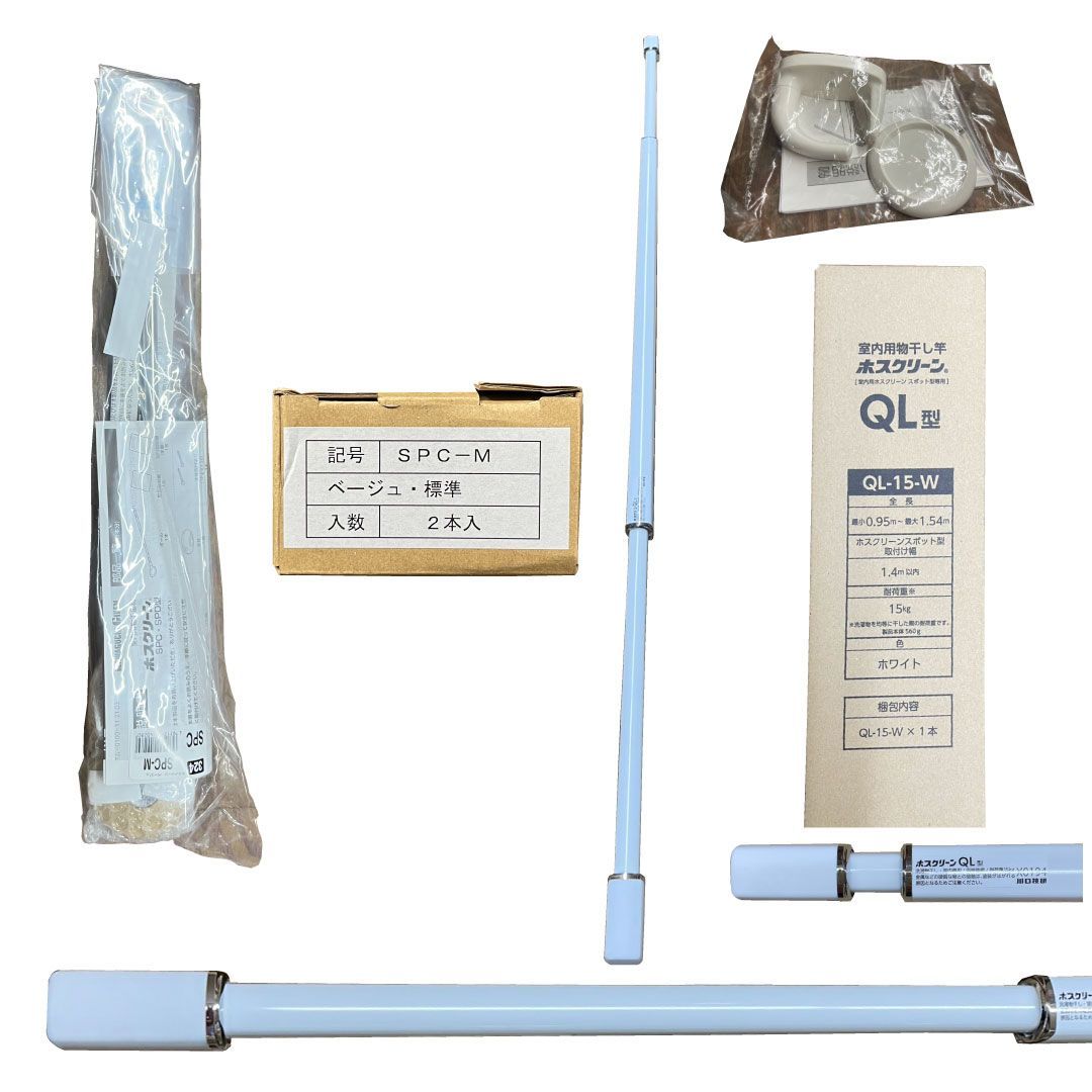 SPC-M(室内物干し本体・座ベージュ)+伸縮竿 QL-15-W(950〜1540mm)+竿立てホルダーSTH-1 の3点が揃っており、落ち着いたベージュカラーでお部屋の雰囲気に合わせやすい仕様です。