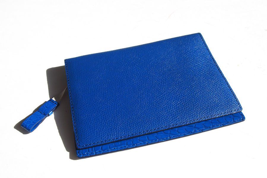 きめ細かで、上質なグレインレザーをベースに、スリット部分にアリゲーター素材を採用した高級感のあるブックカバー(ブルー)です。