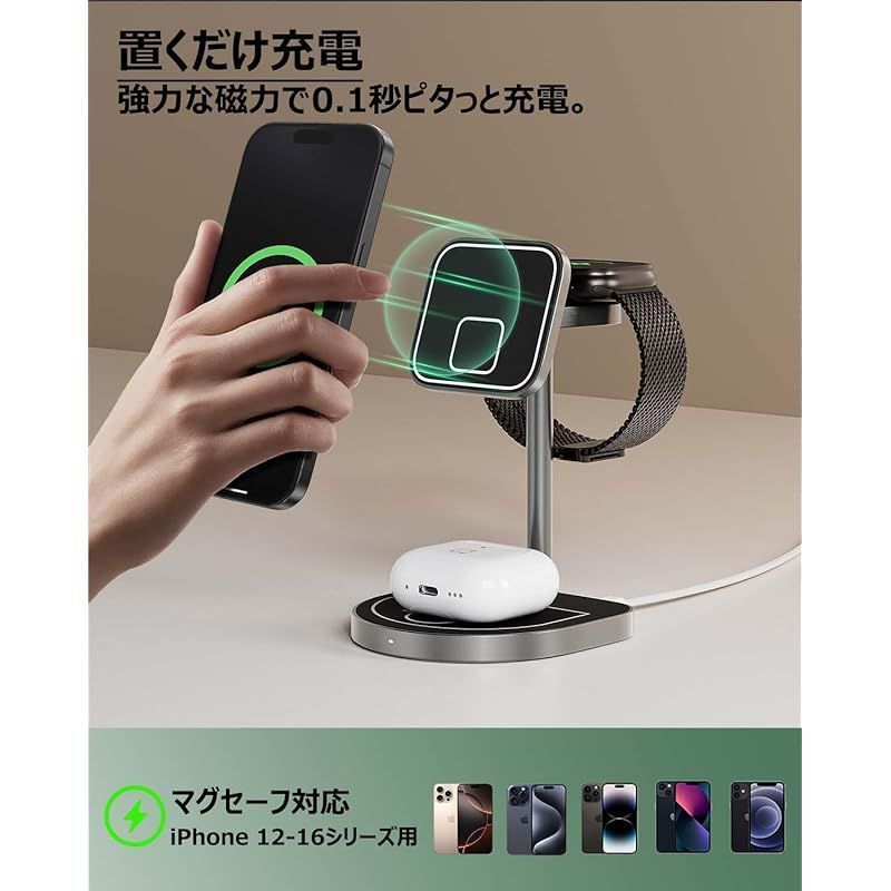 ワイヤレス充電器 3in1は、iPhone16/15/14/13/12シリーズ、マグセーフ充電ケース付きのAirPods、アップルウォッチに対応する一台三役の充電器です。磁気吸着機能により簡単に取り付けて充電が開始され、ケーブルの煩わしさから解放されます。充電スピードは15W、5W、5Wの3つの出力レベルがあり、さらに、過充電防止、過熱防止、異物検知、過電流防止、ショート防止の保護機能を備え、安全性も確保されています。アルミニウム合金製の高級感あふれるボディは、耐久性と放熱性に優れ、シリコン付きの滑り止め加工が施された厚めのベースにより転倒も防ぎます。また、縦置き・横置きが自由に調整でき、充電中に動画視聴やライブストリーミングも楽しめます。18ヶ月の期間も設けられており、不具合が発生した場合には迅速に返金、返品、交換に対応いたします。このワイヤレス充電器 3in1で、デザイン性と機能性を兼ね備えたスマートな充電生活を始めましょう。