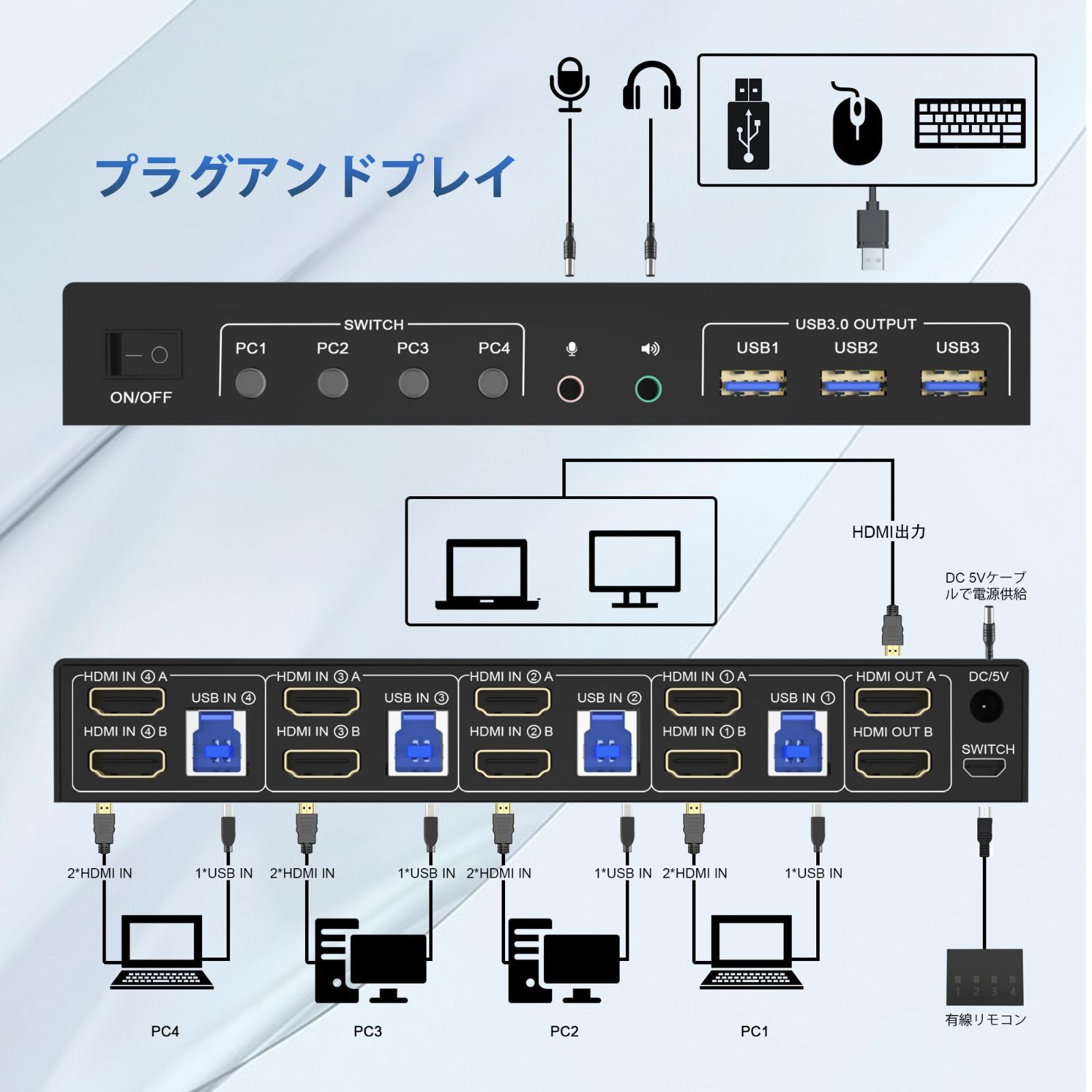 4ポートHDMI KVMスイッチ: このデュアルモニタHDMI + HDMI KVMスイッチは、4台のコンピュータ間で4K HDデュアルモニタと3 USB 3.0デバイスを共有することができます。このデュアルモニタKVMスイッチは、キーボード、マウスの1セットでシングルまたはデュアルモニタを制御するためのものです。仕事とプライベートコンピュータを自由に切り替えることができ、作業効率が大幅に向上します。
