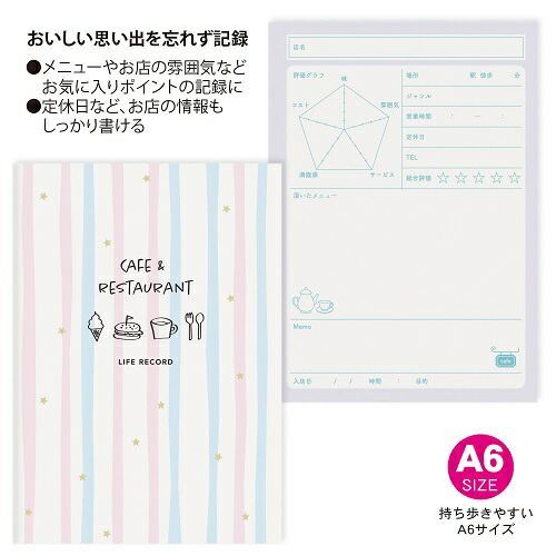 美味しかった思い出や見た目が可愛いメニューなど、お気に入りのポイントを書き込めるスペースやお店の情報も記入できます。A6サイズで手帳などと一緒に携帯したり、ちょうどいいサイズ感で気軽に持ち運べるようにと考えたノートです。【検索ハッシュタグ】#A6サイズ#ノート#目的別#用途別#日記#ダイアリー#書き込み##レストラン#カフェ#食事#評価