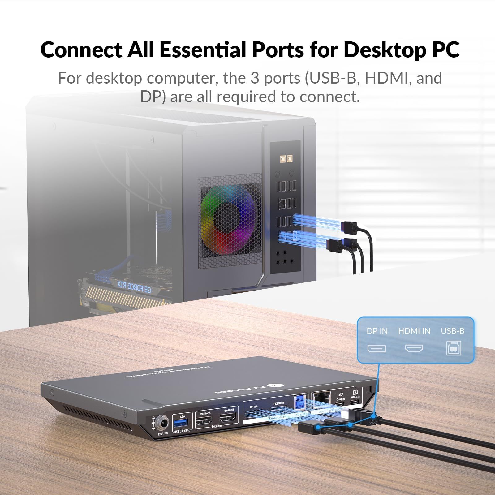 【デュアルスクリーン、デュアル生産性】この多機能KVMスイッチ拡張ドックは、2台のコンピュータ(ノートパソコン1台+デスクトップパソコン1台)を2台のディスプレイに簡単に接続できます。ボタン1つで作業とパーソナルデバイスをシームレスに切り替え、ケーブルの乱れを解消し、効率を最大限に高めることができます。