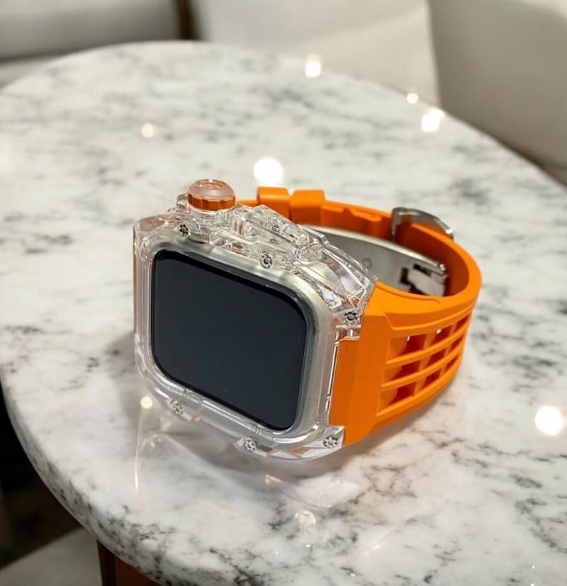 透明感のあるポリカーボネート製スケルトンカバーと、上質なフッ素ラバーベルトを組み合わせたApple Watch用セット。