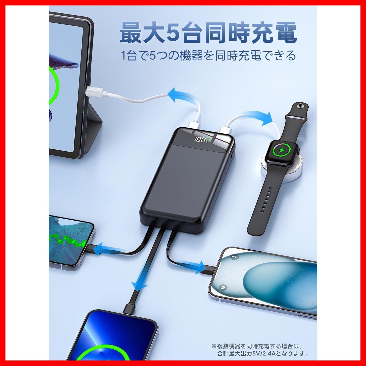 【スマホにササっと急速充電&最大6台同時に充電】大容量56800mAhモデルのN10は、急速充電規格(5V/2.4A)に対応し、いずれも最大12Wの出力が可能、一般的に付属している5W仕様のUSB充電器よりも高速で充電が可能です。【4つの充電ケーブル内蔵】3種類の内蔵出力ケーブル(Type-C&Lightningµ USB)+三つの出力ポート(USB-A1&USB-A2&Type-C)で、最大6台のデバイスの同時充電が可能、コンセントのない場所でも手軽に充電できるため、安心して出かけることが可能。畜電可能な充電ケーブル(USB-A入力)を内蔵することで、別途充電ケーブルを持ち運ぶ必要がなく持ち物を少なくし簡単に充電することが可能で、完全なケーブルレスを実現。ケーブルを忘れたときも充電ができないなんて心配はありません。または、本体にケーブルがすっきりと収納できるので、カバンの中でケーブルが絡まったり断線することを防ぎます。
