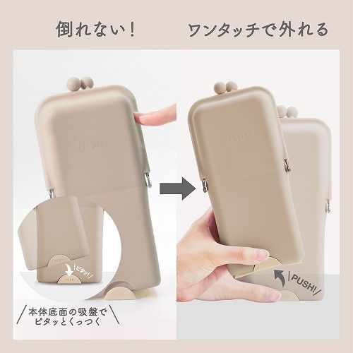 シリコーン製の縦型がま口ペンケースです。人気のくすみカラーで新登場!金具部分も大人カワイイ&高級感のあるゴールドカラー仕上げにグレードアップしました。置くだけでピタッとくっつき倒れない。本体底面の吸盤でピタッとくっつき、空気のチカラでしっかり吸着します(※凹凸のないフラットな面に吸着した場合、垂直方向で3kgの引っ張り強度)。外すときはワンタッチで簡単に外れます。タテにもヨコにもスマホが置ける、大容量でガバッと開くがま口タイプ。シリコン製なので文房具以外に洗面用品や化粧品を入れるのにも便利です。【検索ハッシュタグ】#シリコン#エアピタ