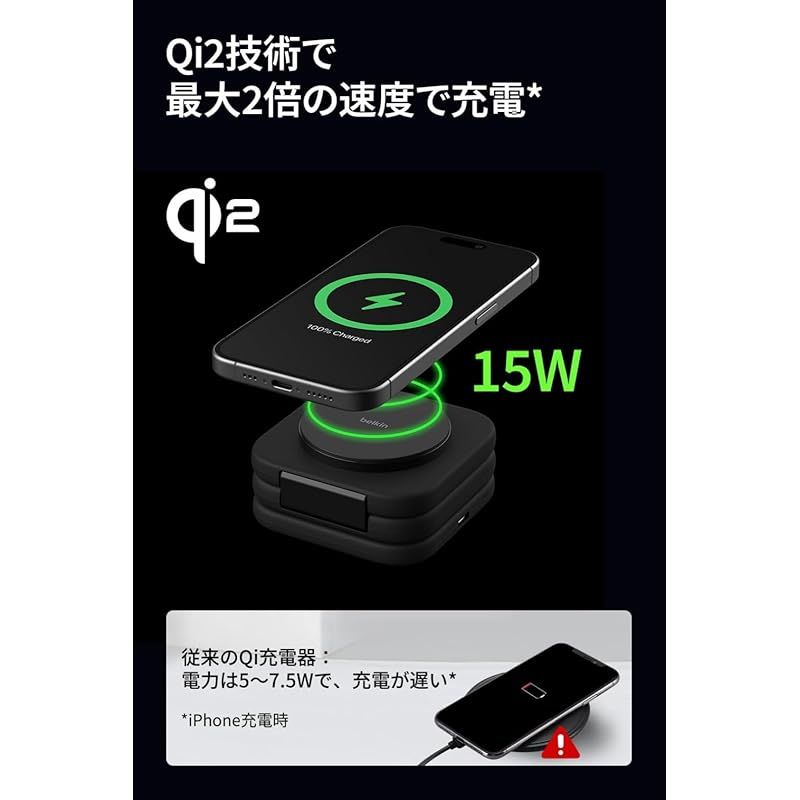 Belkin 3-in-1 Qi 2ワイヤレス充電 ポータブルパッド 2 認証 MagSafe対応 iPhone 16 15 14 13 12 2対応スマートフォン 最大15 W高速充電 Apple Watch 10 9 8 7 Ultra Ult 1