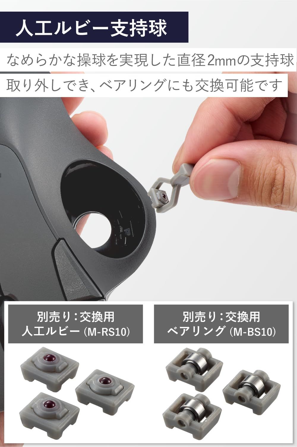支持ユニットに直径2mmの人工ルビーを採用。従来品よりも自然でなめらかな操球を実現しました。支持ユニットは簡単に取り外し可能で、人工ルビーはもちろん、ベアリングにも交換可能です。 ■※交換用の人工ルビーユニット(M-RS10)及びベアリングユニット(M-BS10)は別売です。