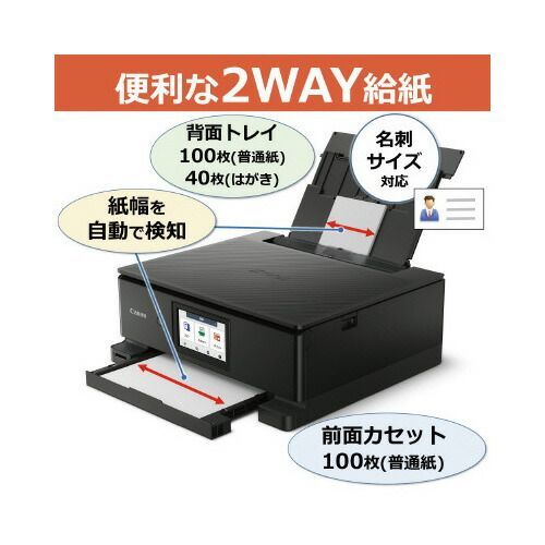●外寸法/約幅372×奥行345×高さ142mm●質量/約6.6kg●給紙容量/前面カセット:普通紙100枚、後ろトレイ:普通紙100枚、ハガキ40枚●インターフェース/IEEE802.11a/b/g/n/ac、Hi-SpeedUSB●カラー/ブラック●用紙サイズ/A4-名刺●印刷速度/A4普通紙:カラー約10.0ipm、モノクロ約15.0ipm●最高解像度/4800(横)×1200(縦)●印刷コスト/A4普通紙(カラー):約12.7円(大容量)、約12.9円(標準容量)●レーベル印刷/対応