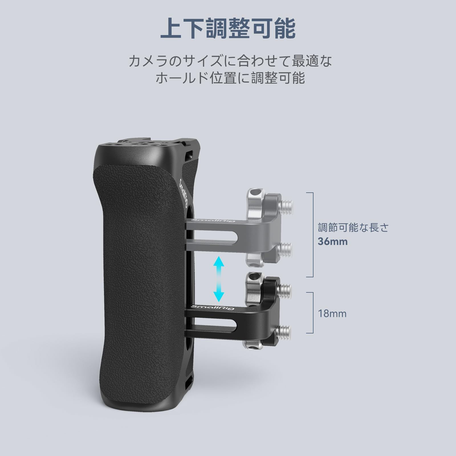 【人間工学】サイドハンドルは手持ちのカーブに設計されて、ハンドルは上下調整可能36mmで、カメラのサイズに合わせて最適なグリップ位置に調整でき、快適な撮影体験ができます。