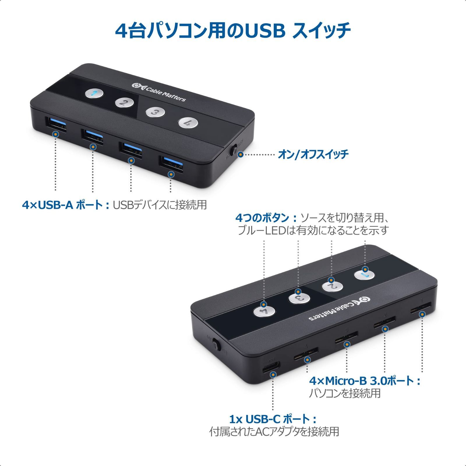 【4台パソコン用のUSB 3.0 スイッチ】Cable Matters 4ポート USB 切替機が4台異なるパソコン間で最大4台のUSBデバイスを共有するための理想的な選択です。付属されたMicro USB USB A 変換ケーブルを使用して、本スイッチにあるMicro-B 3.0ポートをUSB パソコンに接続します。デスクトップ、ラップトップ、およびその他の機器間でケーブルやUSB周辺機器を交換又は抜き差しの必要がなく、リモコンのボタンを押すだけで、ホスト間を切り替えることができ、接続されたデバイスに簡単にアクセスできます。
