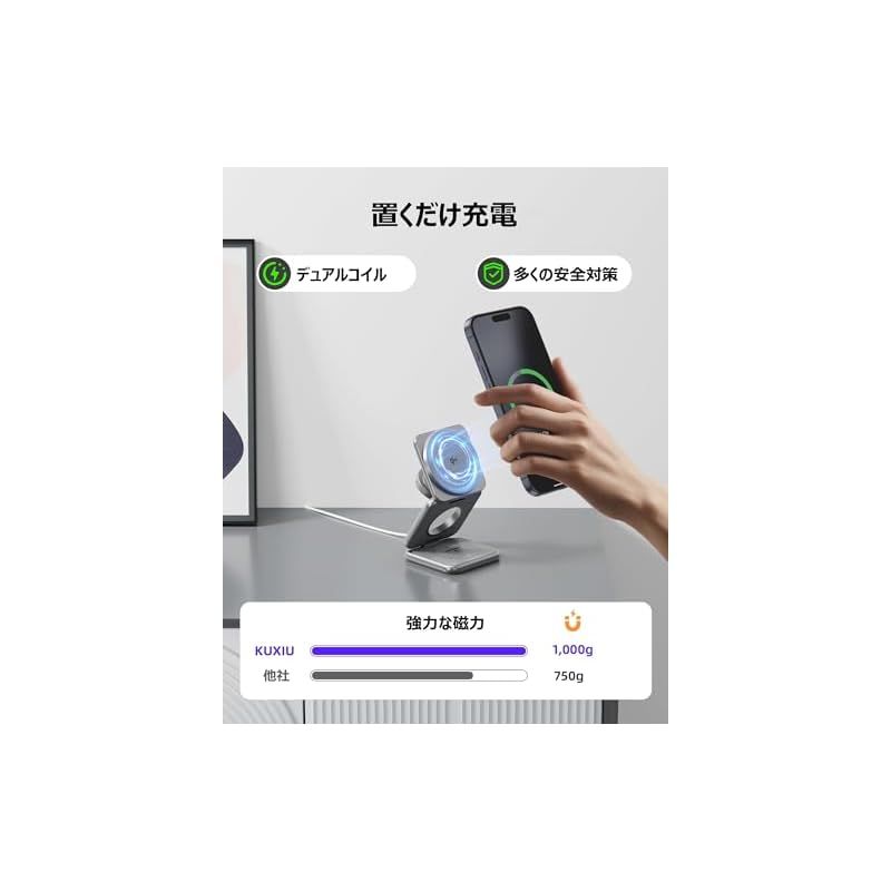 商品名:KUXIU Qi2認証済み ワイヤレス充電器 3in1 Qi2 充電器 スタンド Qi2 Magsafeスタンド 置くだけ充電 最大15W 急速充電器 iphone用ワイヤレス充電器 iPhone16/15/14/13/12シリーズ対応 AirPods/アップ