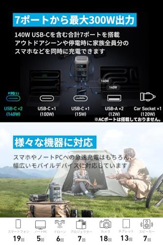 7ポートから最大300W出力:USB-C、USB-A、カーソケットを含む合計7ポートを搭載し、最大300W出力が可能です。キャンプ時に家族全員分のスマホなどを充電することができ、ノートPCへの急速充電はもちろん、カメラやプロジェクター、ドローンなど様々な機器へ給電 / 充電できます。※AC入力・出力ポートは共に搭載しておりません。