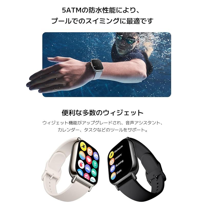 【150種類以上のワークアウトモード】ランニング、ウォーキング、サイクリングなどの基本的なモードに加え、様々なスポーツモードに対応しています。インストラクションに従ってウォーミングアップし、ワークアウトを始めましょう。5ATMの防水性能により、プールでの水泳にも最適です。
