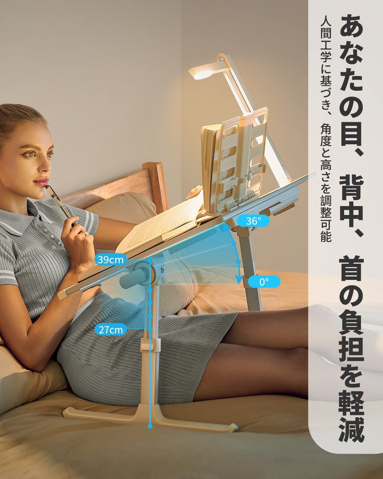 【高度・角度を自由調整】5段階の高さ(27~39cm)を調節できて、お子様から大人まで幅広く適用しています。 天板の下には充分なスペースが用意され、窮屈感なく快適に使用できます。4段階の角度(0~36°)もお好みに 合わせてご自由に調整していただけ、映画を見ながらベッドやソッファで快適に休日を過ごせます。