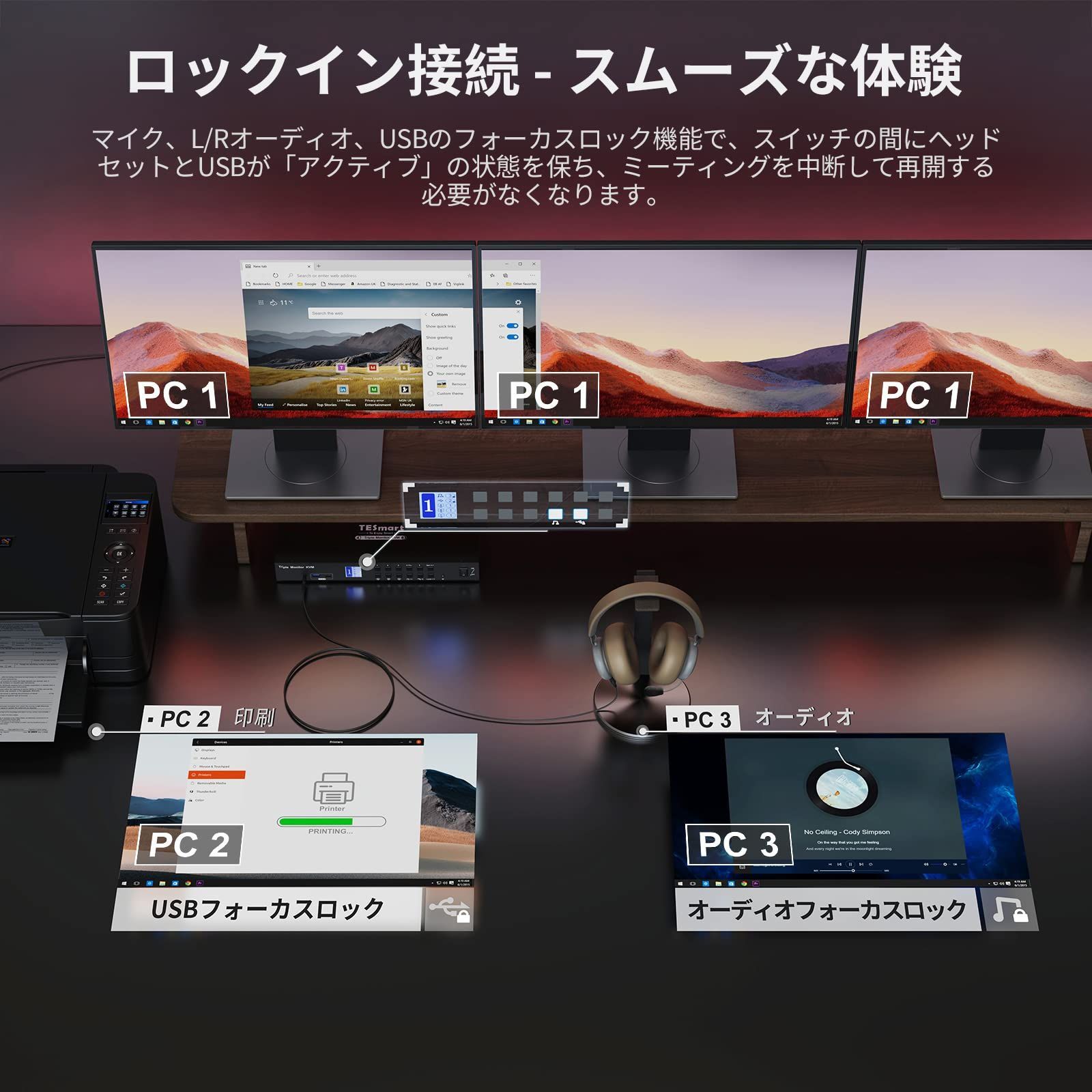 【ロック可能なチャンネル】前面パネルのボタンを押すだけで、USBおよびオーディオチャンネルはロックできます。切り替え時に画面のみを切り替えます。オーディオとUSB 3.0フォーカスロックは独立して操作でき、音声を単独でロックするか、USBを単独でロックすることができます。一方のコンピューターで作業しながら、同時にもう一方のコンピューターでオーディオを聞いたり、文書をスキャンして別のコンピューターに保存することができます。
