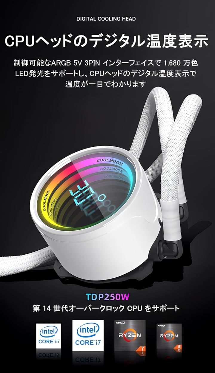 MSI、Asrock、ASUS、Gigabyte様々なマザーボードのARGB 5v 3pinに対応 「商品サイズ」ラジエーター&ファン:120mmx276mmx52mm、CPUヘッド:φ75mmx56mm 「付属品」本体、説明書、各種ブラケット 「注意事項」温度表示機能は、ファンハブを介して接続する場合や、適切なマザーボードの接続コネクタに接続されていない場合、温度表示が正しく機能しない可能性があります。