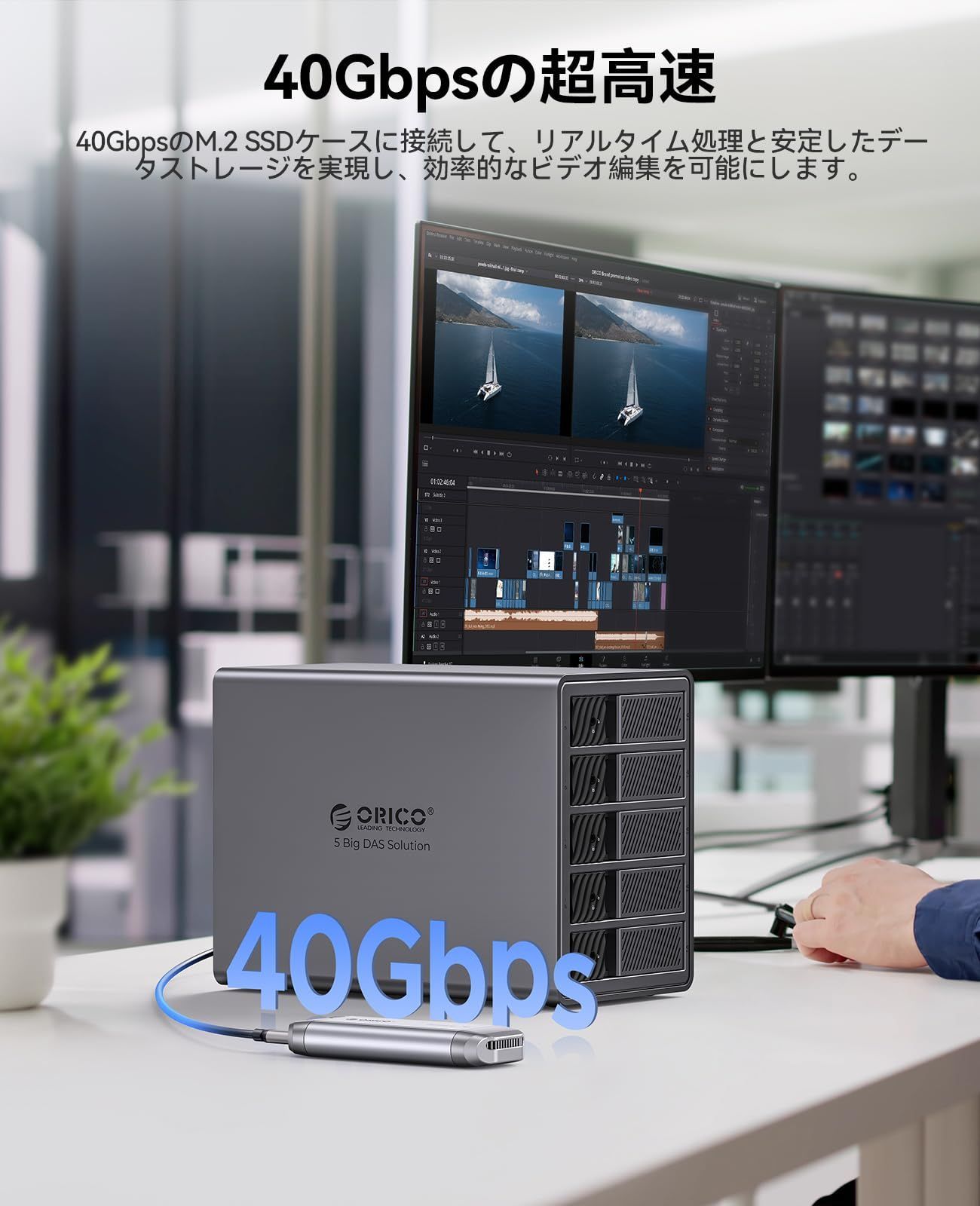 【40Gbps HDDケース】:40Gbps出力ポートはホストインターフェイスに接続し、40GbpsUSB CポートとSATAインターフェイス(6Gbps、合計16Gbps)はデータ転送に使用され、DPポート+40GbpsUSB Cポートはビデオ出力に使用されます。ビデオ編集に最適なストレージソリューション (注:9858T3HDDケースは、Thunderbolt 3/4インターフェイスを搭載したPCにのみ対応しています。 )
