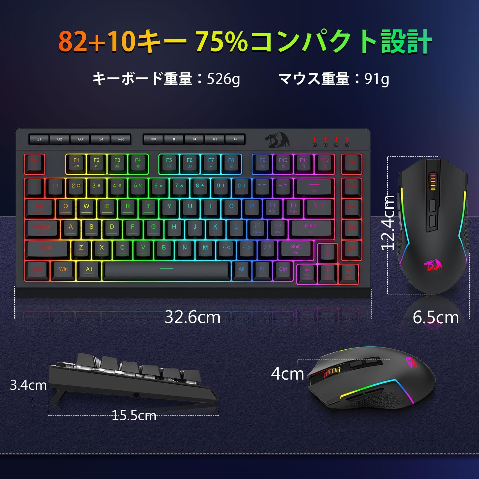 Redragon ゲーミングキーボード マウスセット USB有線 75 英語配列 静音 RGBバックライト メンブレン 26キー防衝突 マクロ対応 プログラマブル ゲーミングマウス 8000 DPI調整 打鍵感 防水 ソフト キーマウ コンパクト P