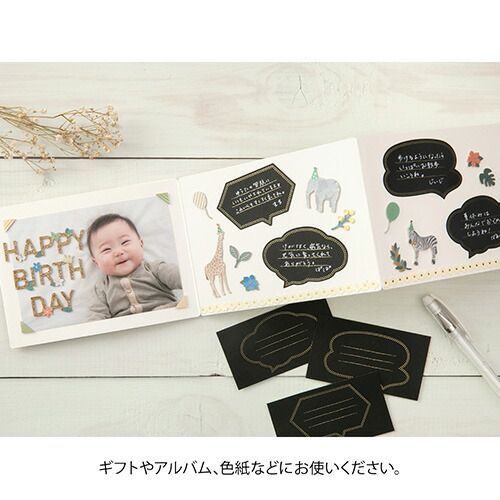 詳細情報ギフトやアルバム、色紙などに使える黒いラベルシールです。不透明インクのペンや色えんぴつで黒い台紙にメッセージが書き込めます。