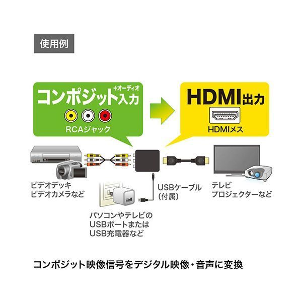 ●コンポジット映像出力を持つビデオデッキやプレーヤーなどをHDMI入力を持つテレビやプロジェクターに接続し出力することができます。