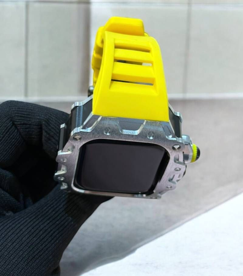 シルバーイエロー 別注強化型シルバーバックルモデル AppleWatc用 カスタム カバーケース 保護 46 アップルウォッチ series 10 11 ラバーバンド ベルト
