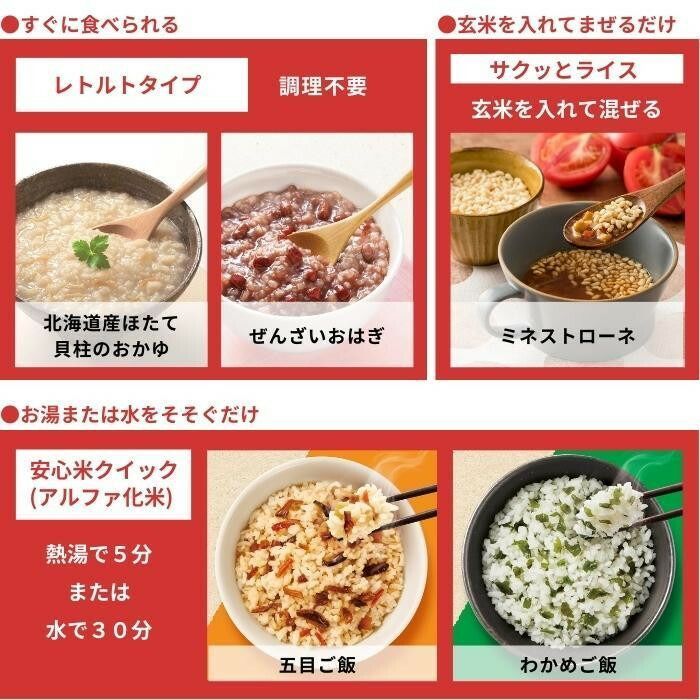 ・安心米クイック 五目ご飯:うるち米(国産)、味付乾燥具材(ごぼう、水煮たけのこ、こんにゃく、食塩、乾しいたけ、乾燥にんじん、植物油、砂糖、かつお節エキス)/調味料(アミノ酸等)、カラメル色素、加工デンプン、酸化防止剤(ビタミンE)、水酸化カルシウム