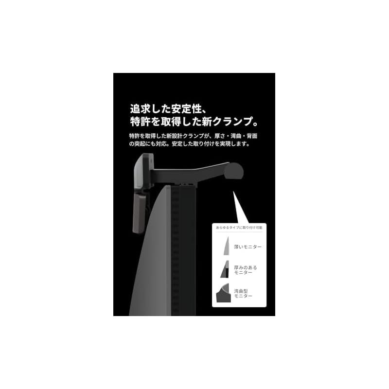 【幅広いモニターに対応&省スペース設計】平面モニター、ウルトラワイド、湾曲型、デュアルモニターに対応。安定性の高いクランプでしっかり固定し、省スペースを確保します。