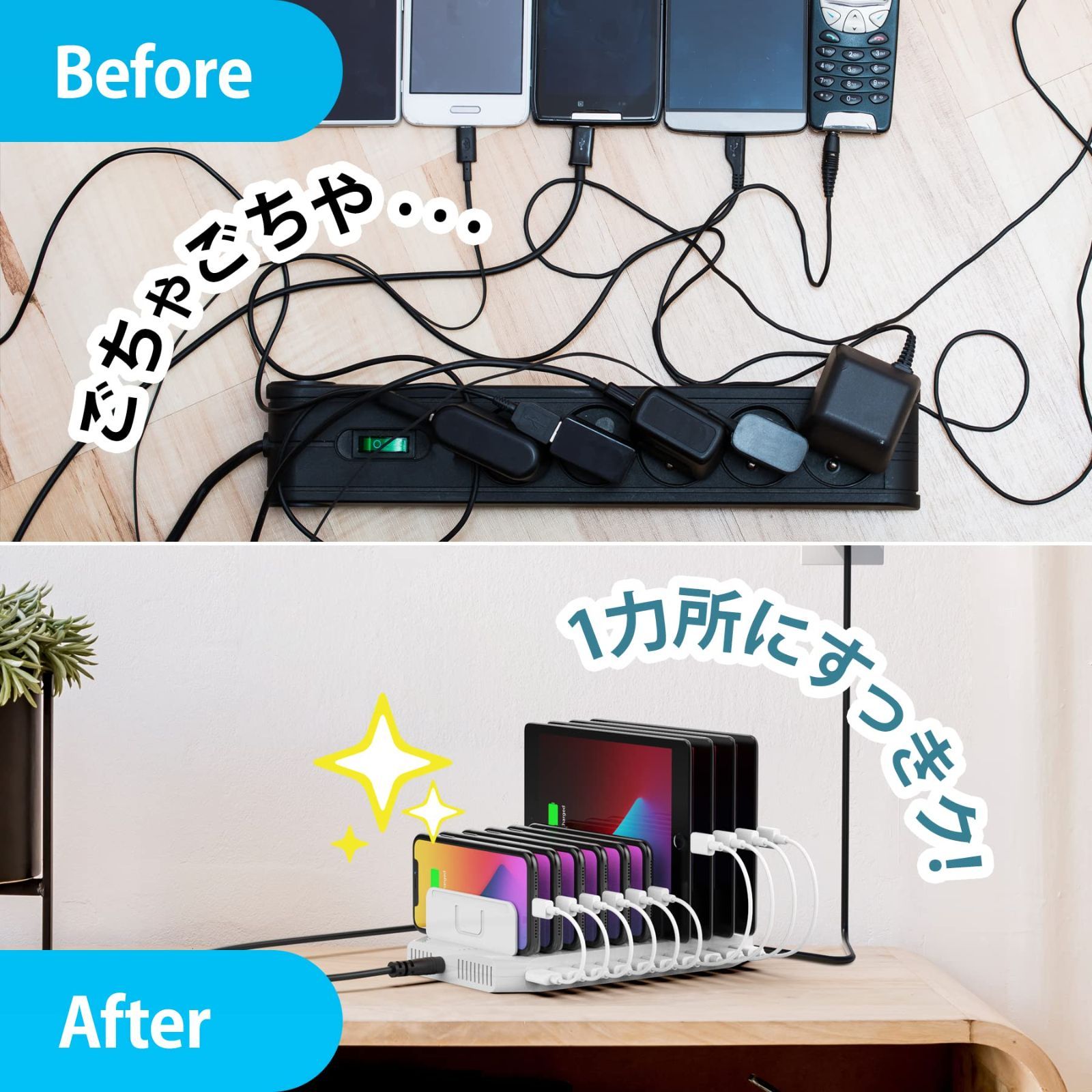 【10台同時充電タイプ】付属の仕切り板(低い板11枚)で最大10台のモバイル機器をキレイに置けます。スマートIC内蔵で充電中、USBデバイス端末に適した最適な電圧を自動的に調整できます。iPadなら最大で8台まで充電できます。