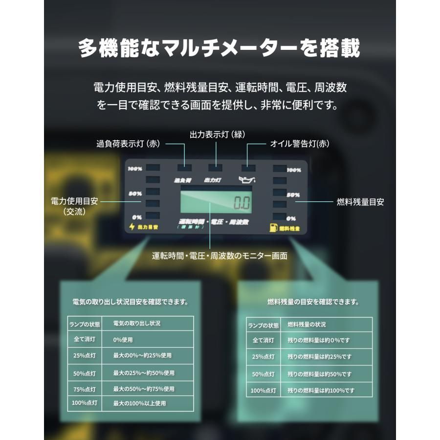 【操作のしやすさと視認性の向上】 多機能デジタルディスプレイを搭載しており、燃料残量、累積使用時間、出力ワット数、電圧、周波数をリアルタイムで確認可能。過負荷時やオイル不足時はLEDインジケーターで知らせるため、運転状況を一目で把握できます。また、点火プラグやエアクリーナー、オイル注入口へのアクセスが簡単で、メンテナンスカバーは工具不要で取り外し可能な設計。これにより、日常のメンテナンスがさらに効率的に行えます。